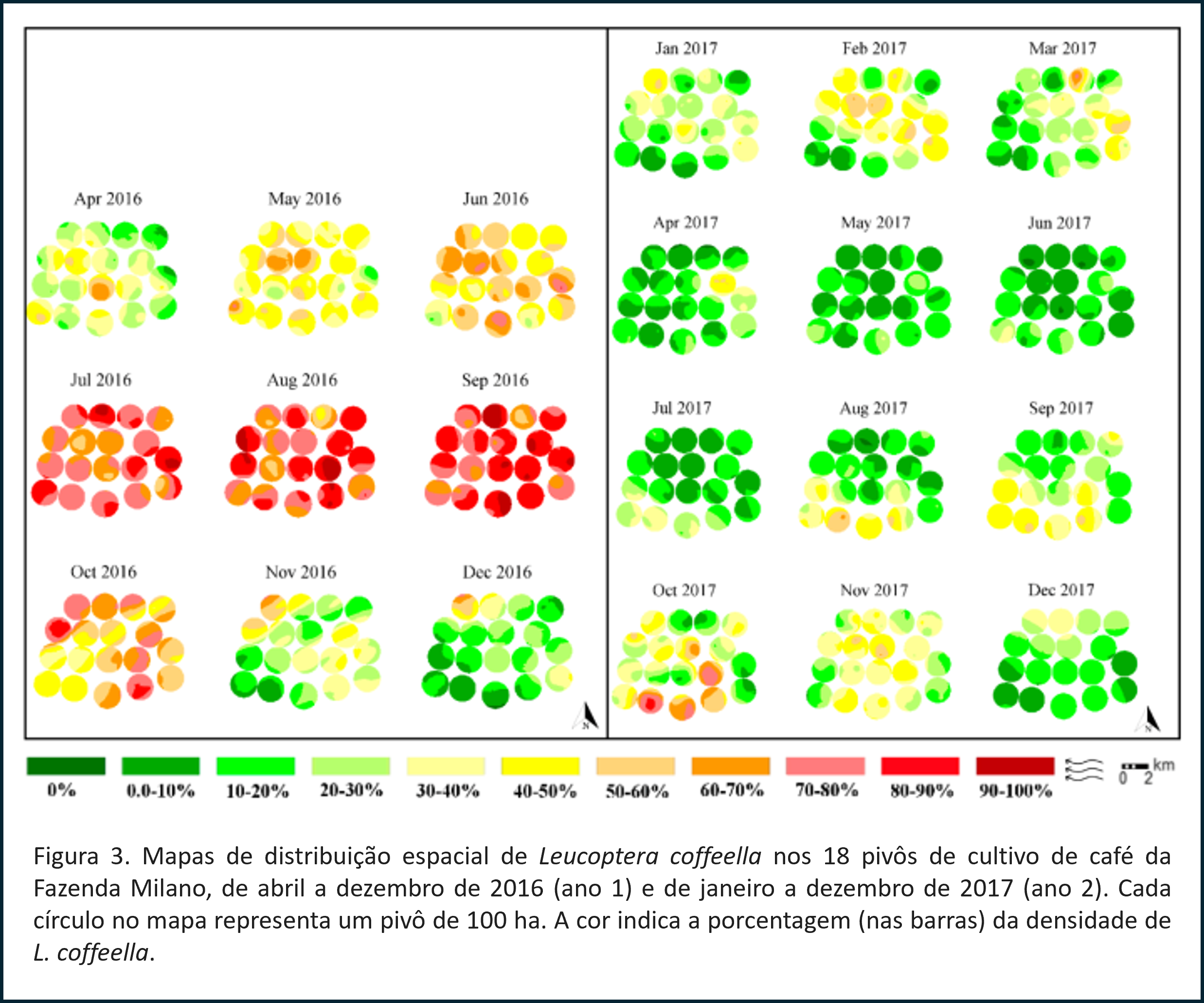 Segundo os pesquisadores, o bicho-mineiro apresentou padrão de agregação em áreas específicas, as chamadas ‘reboleiras’, que mudavam de lugar ao longo do tempo. Observando esta variação espacial imagina-se que o uso uniforme de inseticidas em toda a lavoura pode levar a desperdício e, possivelmente, à seleção de populações resistentes, um fenômeno preocupante para toda a agricultura e já relatado em estudos recentes sobre a praga no Brasil.