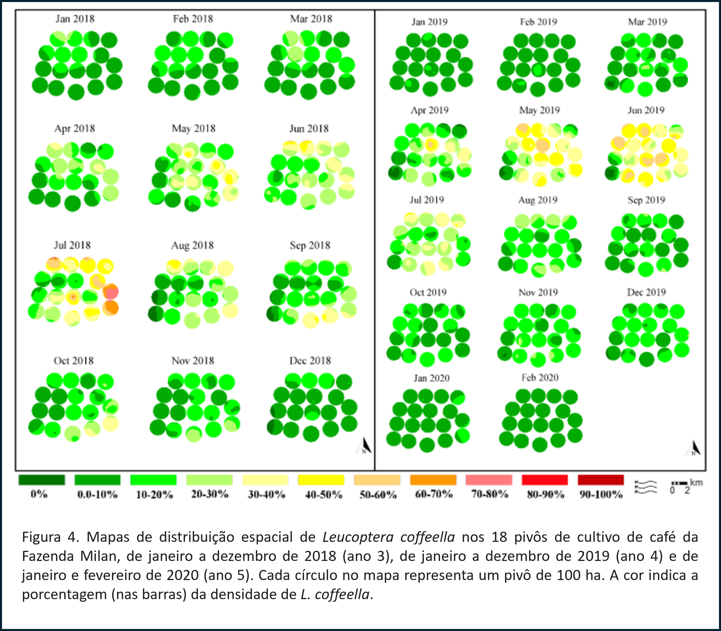 Para identificar essas zonas críticas, a equipe aplicou métodos geoestatísticos, como krigagem ordinária e análise de semivariogramas, gerando mapas de densidade da praga em diferentes momentos (Figuras 3 e Figura 4 do artigo). Os resultados mostraram que o inseto se concentra em pontos com maior temperatura e menor precipitação, permitindo prever onde os surtos começam. Essa abordagem abre caminho para um manejo de precisão, em que o inseticida é aplicado apenas onde há risco real de dano econômico.